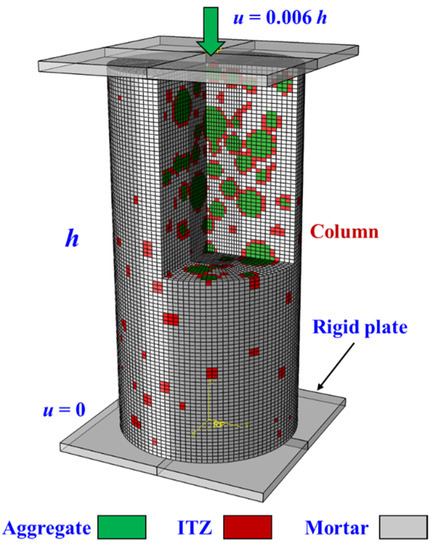 In Figure 2, the numerical concrete column is subjected to axial compression, where the coarse aggregate, the mortar, and interfacial transition zone (ITZ) are represented by green, gray, and red colors, respectively.