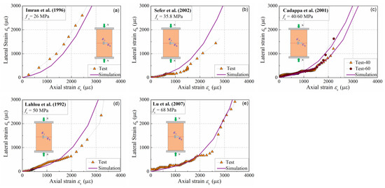 Comparison of the lateral–axial strain relationship: (a) fc = 26 Mpa; (b) fc = 35.8 Mpa; (c) fc = 40/60 Mpa; (d) fc = 50 Mpa; (e) fc = 68 MPa.