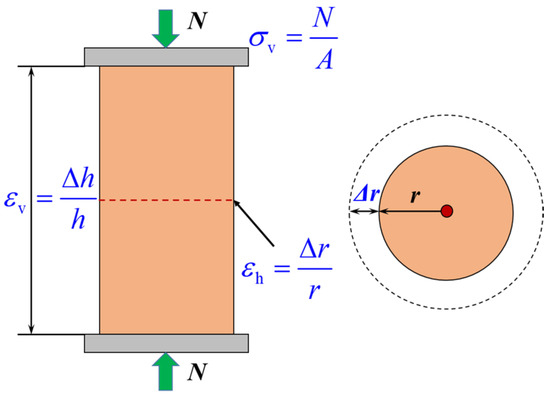 The properties of concrete specimens subjected to axial compression were studied through parameter analysis, and it was found that they had a similar failure process. Figure 5 shows the schematic diagram of axial strain and lateral strain. In the simulation, the axial displacement Δh and radial displacement Δr were extracted and divided by the height h and diameter r of the specimen, respectively, as shown in Equations (16) and (17), and the axial strain εv of the specimen and lateral strain εh at the middle section could be obtained. The secant strain ratio is the ratio between lateral strain and axial strain, as shown in Equation (18).
