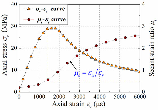 Figure 6 depicts the development of the stress–strain curve and secant strain ratio–strain curve. It shows that the secant strain ratio increases slowly when the axial strain is less than 1000 με, because the cracks in the specimen grow slowly in the elastic stage. The result is consistent with the study conducted by Spoelstra and Marques [60,61]. With the increase in axial strain, the secant strain ratio increases rapidly.
