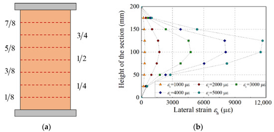 Distribution of the lateral strain along the specimen height: (a) location of the measured section; (b) distribution of the lateral strain.