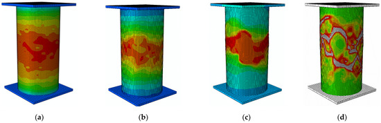 Field of radial displacement and stiffness damage in concrete specimen: (a) Ur at 1000 με; (b) Ur at 2000 με; (c) Ur at 4000 με; (d) SDEG at 2000 με.