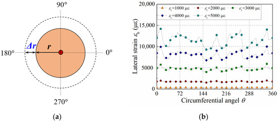 Distribution of the lateral strain along circumferential direction: (a) middle section of the specimen; (b) distribution of the lateral strain.