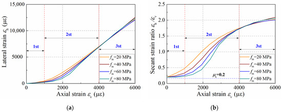 - The development of lateral strain and secant strain ratio can be divided into three stages. In the first stage, the lateral strain is small and the secant strain ratio increases slowly from 0.2. In the second stage, the lateral strain and the secant strain ratio increase rapidly as the internal cracks continue to accumulate. In the third stage, the lateral–axial strain curve is approximately linear, and the secant strain ratio grows slowly and approaches its critical value.