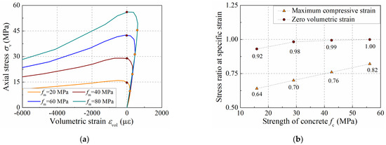 Figure 11b depicts the stress ratio at maximum compressive strain and zero volumetric strain, where stress ratio represents the ratio between stress at a certain strain and the maximum stress. It shows that the stress ratio at maximum compressive strain increases from 0.64 to 0.82 when the mortar strength varies from 20 MPa to 80 MPa, illustrating that the initiation of cracks starts later in concrete specimens with higher strength. The volume of concrete changes from compression to dilation when the volumetric strain reaches zero, and the stress ratio at this point is approximately equal to 1.0. That is to say, the secant strain ratio is about 0.5 when the axial stress reaches the concrete strength, which is consistent with the literature [28,60,61].