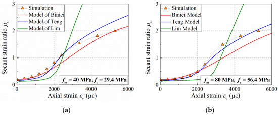The secant strain ratio–strain relationship: (a) fm = 40 MPa; (b) fm = 80 MPa.
