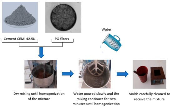 Fiber-reinforced concrete mixes were prepared by varying the volume fractions of fibers (Vf): 0%, 5%, 10%, 15% and 20%. The mixing was carried out mechanically at low speed with clean equipment. The cement powder was initially mixed dry with the PO fibers until a homogeneous mixture was obtained. Then, water was poured slowly into the mixture with a water/cement (W/C) ratio equal to 0.50 and the mixing continued for two minutes until the mixture was homogenized. The molds were carefully cleaned of all impurities and a layer of liquid oil was applied to the interior surfaces of the molds to facilitate demolding (Figure 1).