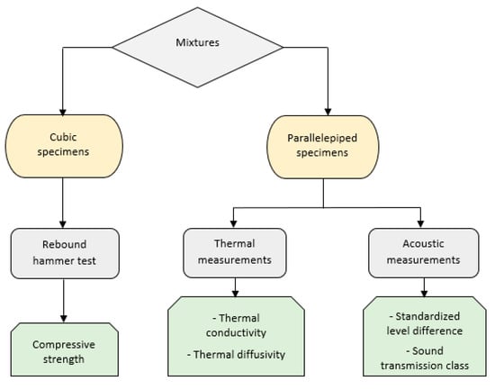 Parallelepipedic specimens of dimensions 270 mm × 270 mm × 40 mm were prepared for the thermal and acoustic tests, while cubic specimens of dimensions 150 mm × 150 mm × 150 mm were prepared for the Schmidt rebound hammer test. For each test, three samples were prepared to take an average value. After 24 h, the samples were carefully removed from their molds and stored in the laboratory at room temperature of 20 ± 2 °C. Figure 2 shows the flow chart of the experimental study.