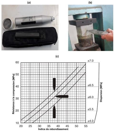 The Schmidt rebound hammer test makes it possible to test the homogeneity of the concrete in situ and to obtain a rapid estimate of the compressive strength of the concrete of a structure without taking samples of hardened concrete viacore drilling. The principle of this test is to project a mass onto the concrete surface to determine the rebound value RN and translate it into the compressive strength value of the material tested using the chart (Figure 4c) provided with the device [].