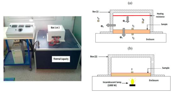 The thermal diffusivity was measured using the same device as that used for the measurement of the thermal conductivity. A 1000 W incandescent lamp was placed on the upper face of box (2) in place of the heating resistor (Figure 5b). To homogenize the flux on the irradiated face of the sample, the box was fitted with reflective internal faces.