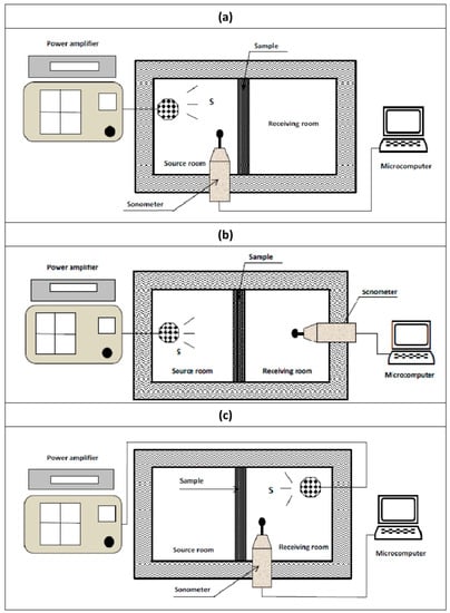 The average sound pressure level L1 was determined by placing the sonometer and the sound source (S) in the source room (Figure 6a). Then, a measurement of the average sound pressure level L2 was carried out by moving the sound level meter in the reception room (Figure 6b). Finally, the reverberation time Tr was determined by bringing the source back into the receiving room (Figure 6c).