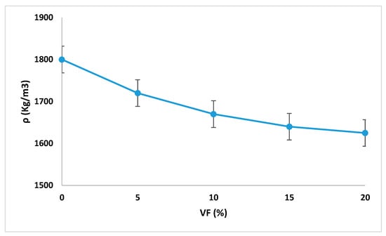 According to the results of Figure 7, it is noted that all the samples containing fibers satisfied Equation (1). In addition, the density obtained for Vf = 0 was lower than the mass of the sample without fiber. It was clear that the incorporation of fibers in the cementitious matrix considerably increased its porosity.
