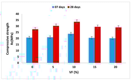 Figure 8 presents the results of the mean values of the compressive strength (Rc) determined on the cubic specimens of dimensions 150 mm × 150 mm × 150 mm at the ages of 7 and 28 days using the Schmidt rebound hammer test for a fiber content ranging from 0 to 20% by volume. According to the results, it can be seen that the addition of PO fibers improved the compressive strength of the mixtures and reached a maximum value of 33.60 MPa for 10% volume of fiber content. Beyond this value, a slight decrease in compressive strength was observed with increasing fiber volume up to 20%. This behavior was due to an increase in the porosity of the mixtures, and therefore, a reduction in fiber-matrix cohesion.