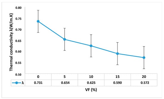 The thermal conductivity was experimentally determined using the parallelepipedic specimens of dimensions 270 × 270 mm × 40 mm3 at the age of 28 days. Figure 9 presents the results of the thermal conductivity measurements obtained experimentally using the box method.