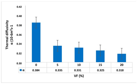According to the results, it was noticed that the thermal diffusivity of the composites decreased slightly with the addition of fibers in the cementitious matrix. It varied from 0.384 × 10−6 m2·s−1 (0% fibers) to 0.318 × 10−6 m2·s−1 (20% fibers), i.e., a total reduction of 17.20%. Indeed, a significant decrease of 12% was observed from the incorporation of 5% of fibers; then, a very small variation in thermal diffusivity (about 2%) was observed for the volume fractions of fibers of 10, 15 and 20%.