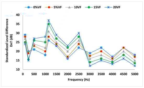 The variation of the standardized level difference (DnT) with respect to the frequency for the different mixtures is given in Figure 11. An increase in the values of DnT was noted for the frequency ranges of 400 to 1000 Hz and 1600 to 2500 Hz. For the other frequencies, the values of DnT decreased, especially for high frequencies that exceeded 3000 Hz. This result was expected since the improvement was a function of the existence of the communicating pores and the increase in the mass of the mixtures. According to the results of Figure 6, we also noted that the addition of PO fibers seemed to have a positive effect on the DnT of the mixtures, especially for the one made using 20% by volume of fibers and whose value could reach 37 dB.