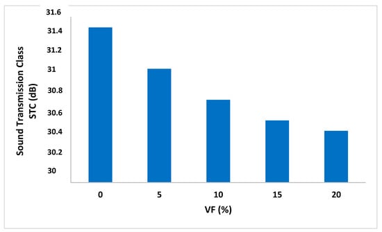 The variation of STC of the mixtures according to the content of PO fibers is presented in Figure 12. It could be seen that the STC of PO fiber reinforced cementitious composites decreased as the fiber volume increased due to an increase in air voids in the mixtures. Indeed, the STC values decreased from 31.5 to 30.5 for the volume fractions of fibers ranging from 0% to 20%, which corresponded to a reduction of about 3%.