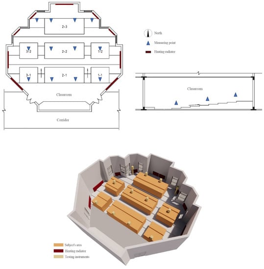 The present study was conducted in the middle of the heating season, in November and December 2021, when the indoor thermal environment parameters were more stable and less affected by the outdoor environment. Note that teaching activities were from 8:30–20:30. Thus, the test period selected was in the middle, from 14:00 to 15:00, because the morning teaching activities could make the thermal environment in the classroom reach a stable state. Therefore, the afternoon measurement was more representative. The selected building was built in 2014. Additionally, the selected classroom was facing north in order to avoid the effects of direct sunlight. The classroom had an octagonal shape and 150 seats, with a floor height of 3.8 m and an area of 128 m2. As shown in Figure 2, the classroom was equipped with heating radiators but without ventilation systems. Table 2 summarizes the thermal properties of the building envelopes. The thermal properties of the building envelopes met the requirements of the Design Standard for Energy Efficiency in public buildings [].