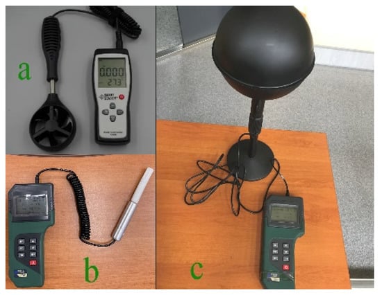 Test instruments: (a) Hot-wire anemometer, (b) temperature and humidity meter, (c) black globe thermometer.