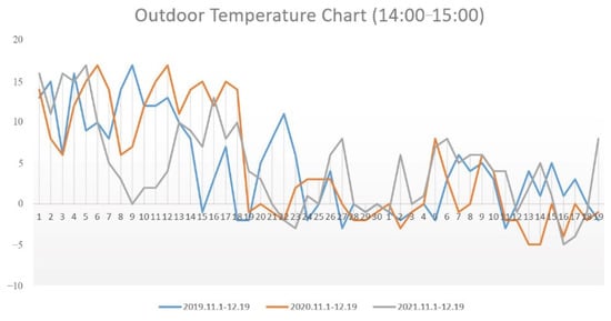 First, as mentioned before, Shenyang is located in cold region C. Additionally, the selected project was an indoor site and the actual measurement time was from 1 November 2021, the heating start time, to 19 December 2021. After 20 December, the school was closed for examination week, and in January 2022, the school was closed for the winter vacation. Thus, the site environment at the selected time interval represented the heating season for the college classrooms. Second, a comparison of the outdoor temperatures taken during the period of 1 November 2019–19 December 2021 shows that the average outdoor temperature at 14:00–15:00 during this interval was 4.7 °C, and the average outdoor relative humidity was 65.2%, as shown in Figure 6 and Figure 7.