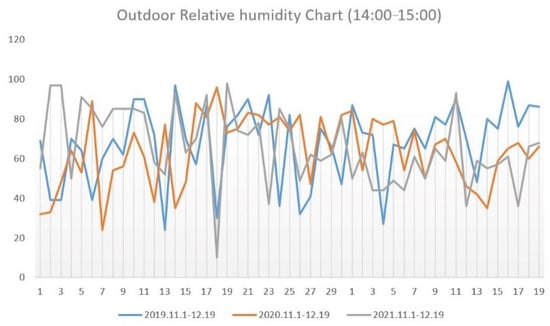 Outdoor relative humidity variation from 14:00 to 15:00 on 1 November 2019–19 December 2021.