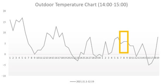 Furthermore, some researchers have also used a three-day time volume for refinement analysis [,]. Thus, 7–9 December 2021 was selected for the specific analysis of the indoor environmental parameters because the outdoor temperature and relative humidity for these three days were closer to the average outdoor temperature and relative humidity in previous years and were more stable, with a standard deviation of 0.5 °C and 4.5%, as shown in Figure 8 and Figure 9 and the box is the value of 7–9.