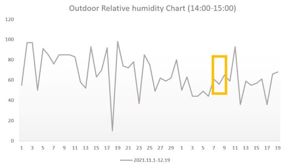 Outdoor relative humidity variation from 14:00 to 15:00 on 1 November–19 December 2021.