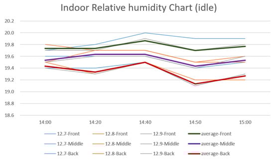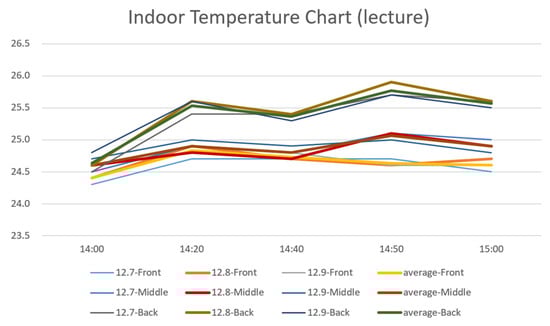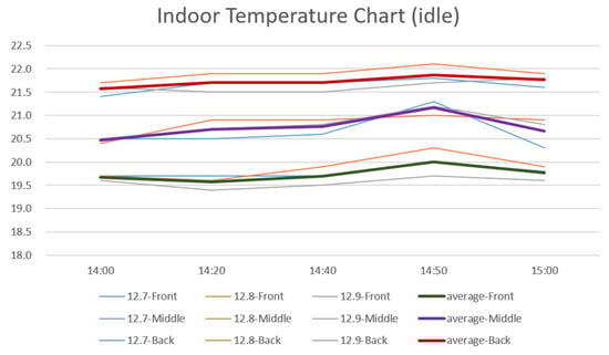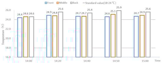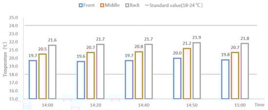 The temperature in the front, middle, and back of the classroom during the idle state remained relatively stable (Figure 14), with an average temperature of 19.8, 20.8, and 21.7 °C, respectively. Thus, all three areas meet the Chinese standard (GB50736-2012) [], which stipulated the standard of 18–24 °C. Note that the back area is higher than the other two areas due to its relative position, and that the air with higher temperature is less dense and moves to the upper part of the space more easily. Thus, the temperature in the back is higher than in the other two areas.