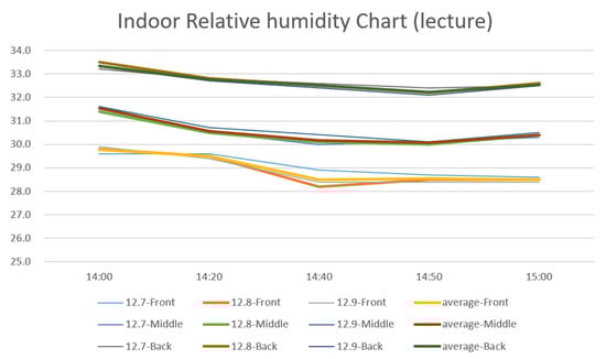Figure 17 shows that the overall relative humidity in the classroom increased significantly by 11.4% as compared to the idle state. This indicates that the dispersed humidity caused by a large number of people can lead to a more significant increase in the relative humidity of the room. However, the overall relative humidity tended to decrease over time in the classroom, indicating that the increase in temperature increases the rate of saturated water vapor much faster than the increase in absolute humidity, which in turn contributes to the decrease in relative humidity. The average relative humidity for the front area of the classroom was 28.9%, which is below the control range of 30–60% for indoor phase humidity during the heating period in winter, as stipulated in the Indoor Air Quality Standard (GB/T 18883-2002) []. The average relative humidity of the middle and back areas were 30.5 and 32.7%, respectively. Note that the water vapor is in the upper part of the space due to its lighter density as compared to the air density. This causes the relative humidity to be the largest in the back area, where the class seating position is relatively high. Although the temperature in the back area of the class is also the highest under this condition, the effect of temperature on the overall regional relative humidity is much less than the effect of water vapor.