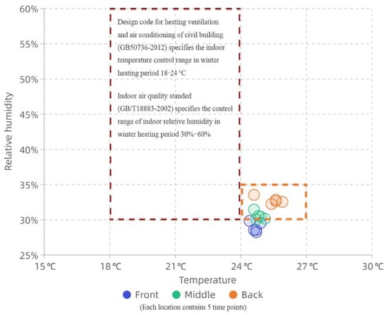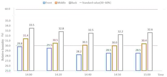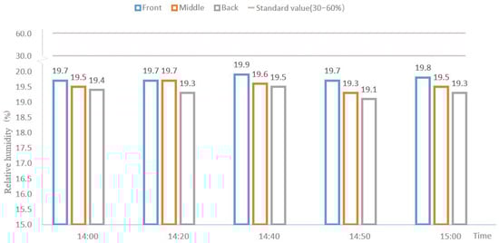 Figure 15 shows that the average relative humidity in the three areas within 60 min was 19.8, 19.5, and 19.3%, respectively. As shown in the figure, the back area has the lowest value because the relative humidity is the ratio of the current humidity to the saturation humidity. Thus, when the temperature rises, the ability of the air to carry moisture increases, and the saturation humidity rises accordingly; meanwhile, the relative humidity falls. Furthermore, during the test period, the difference between the average relative humidity of the three areas is small, not more than 1%, and none of them meet the Chinese standard (GB/T 18883-2002) []. In addition, the control range of indoor phase humidity during the winter heating period is 30–60%.