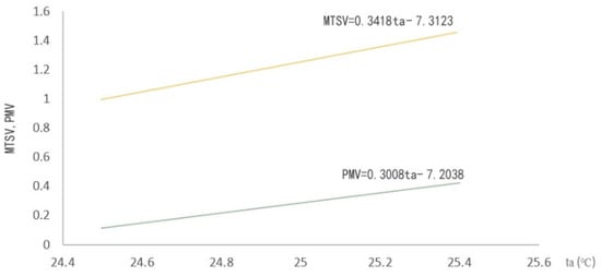where PMV is the predicted thermal sensory vote value, and ta (°C) is the room temperature.