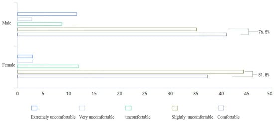 Information about the students’ sex is summarized in Table 8. As can be seen in Figure 22, in terms of gender influence, 81.8% of females and 76.5% of males voted for thermal comfort concentrated between −1 and zero. The average temperature in the classroom in the previous field test was 24.9 °C, indicating that at room temperatures above the prescribed value of 24 °C [], thermal comfort values were higher for females than for males in the same thermal environmental conditions. It should be noted that some studies on the same severe cold climate zone used a linear relationship between AMV (actual mean vote) and room temperature for different gender groups []. These studies calculated the thermal neutral temperature of male and female subjects as 21.6 and 22 °C, respectively. Through the field measurements, the present study also proves that women prefer a warmer environment.