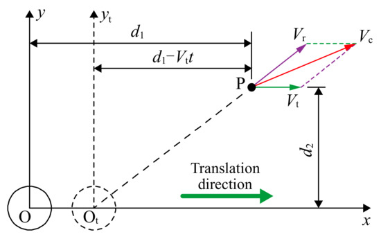 As shown in Figure 1, the downburst of interest moves forward with a translation speed . The initial coordinate of the observation point P relative to the downburst center O is set to . As the downburst moves, the above coordinate is updated to at time t. Hence, the radial speed vector of the observation point can be obtained by: