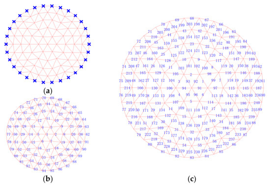 A long-span single-layer spherical reticulated structure was selected for analysis. The structure was modeled in the working environment of MATLAB software by using the finite element method. As shown in Figure 2a, three-way hinged supports are set at the outermost nodes of the structure. Its eaves height is 10 m, and the cross-sectional size of the structural element is Φ132 mm × 5 mm. The elements are linked through rigid connections.