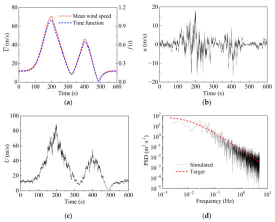 Figure 3 shows the simulated downburst at node 9 on the baseline model. It is obvious from Figure 3a that the time function well reflects the variation of the mean wind speed. In addition, the comparison of PSDs, displayed in Figure 3d, shows that the simulated PSD was consistent with the target one, indicating the reliable simulation of the fluctuating wind speed.