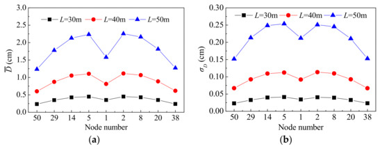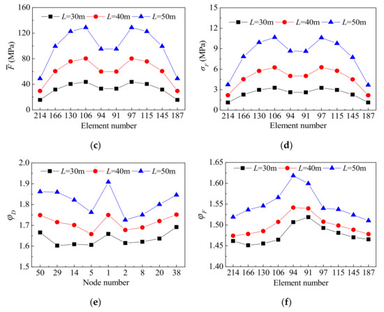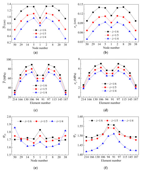 Figure 4 shows the structural responses versus different spans. It was observed that with the increase of span, the mean and fluctuation of the nodal displacements and elemental internal forces increase synchronously. This synchronicity arises from the fact that increasing the span decreases of the structural stiffness. In addition, the DVCs of nodal displacement and elemental internal force also increase gradually with the increasing span.