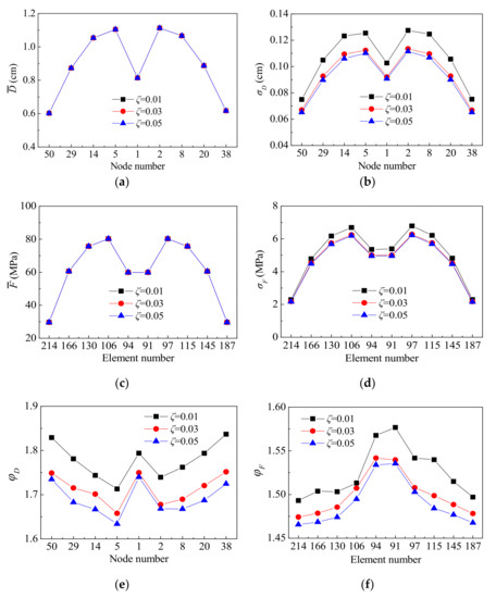 Structural responses versus different damping ratios: (a) mean displacements of nodes; (b) mean square displacements of nodes; (c) mean internal forces of elements; (d) mean square internal forces of elements; (e) DVCs of nodal displacement; (f) DVCs of elemental internal force.