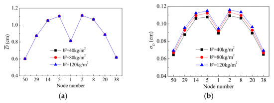 In the following analysis, the roof mass is concentrated to the structural nodes. Moreover, it should be noted that when investigating the influence of a certain parameter, the other parameters are kept constant and the same as those of the baseline model. Due to the randomness of downburst wind loads, each possible parameter combination requires numerous simulations in order to allow for proper statistical analysis and the discovery of any trends in the structural response. Furthermore, due to the geometric symmetry of the structure and for convenience, a group of radial nodes and elements located at the structural symmetrical position was representatively selected for analysis. The fluctuations in the nodal displacements and elemental internal forces are described by their mean square deviations, which can be obtained from: