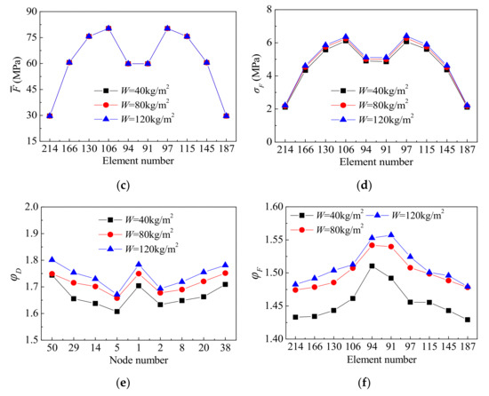 Structural responses versus different roof masses: (a) mean displacements of nodes; (b) mean square displacements of nodes; (c) mean internal forces of elements; (d) mean square internal forces of elements; (e) DVCs of nodal displacement; (f) DVCs of elemental internal force.