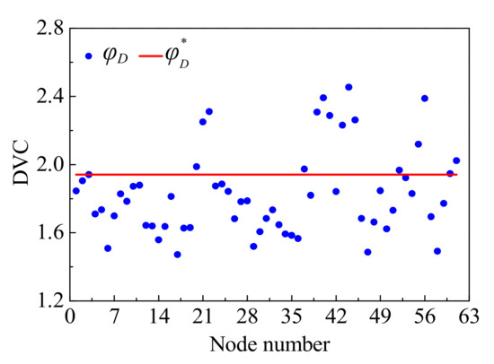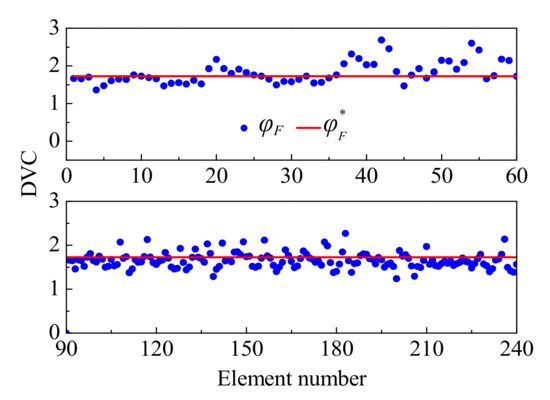 As shown in Figure 8 and Figure 9, analyzing the vibration response of the baseline model reveals that the DVCs of nodal displacement and elemental internal force are extremely non-uniform. And for quite a few nodes and elements, the DVCs are greater than their corresponding global DVC. However, the computed results demonstrate that these nodes and elements with greater DVCs tend to have relatively smaller responses, implying that they can hardly control structural safety. Finally, it is clear that these nodes with DVCs greater than the corresponding global DVC are primarily located near the structural constraints, which can also be explained as described in Section 4.3.