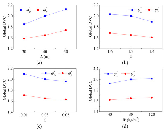 Influences of structural parameters on the global DVCs: (a) span; (b) rise–span ratio; (c) damping ratio; (d) roof mass.