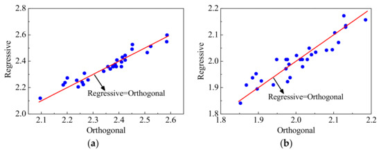 Figure 12 compares the design DVCs obtained via regression (i.e., Equation (17)) and those obtained through orthogonal calculations. It can be found that the design DVCs of both displacement and internal force closely follow an ideal straight line, on which the design DVCs obtained from regression are equal to those obtained from orthogonal calculations.