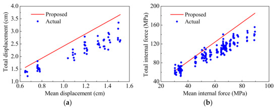 To further demonstrate the reliability of the above regression models, a structure with parameters L = 38 m, , and was selected as the basis for a new case study. The proposed and actual total responses are compared in Figure 13, where the proposed total responses were obtained via the design DVCs calculated by Equation (17). It is obvious that the actual total responses are well within the envelope set by the proposed responses, especially for the nodes and elements with large responses.