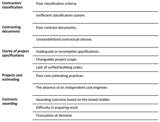 Both “poor classification criteria” and “inefficient classification system” obtained average consensus rate of 0.715 and 0.746, respectively, to be consensually considered challenging factors in the public construction tendering phase in Saudi Arabia. These two attributes appear to be rooted in the local public construction sector, because this agreement concurs with Al-Barrak’s [] and Almutairi’s [] assertions that the mechanisms of the contemporary contractors’ classification system in Saudi Arabia are somewhat ambiguous and unclear. Furthermore, it is consistent with Alsugair and AbuThnain [] regarding the inefficiency of contractors’ classification criteria in Saudi Arabia. One of the expected consequences of this vagueness and inefficiencies of the prequalification process is discouraging contractors [], which in turn leads to the unwillingness of most of them to participate in future bids. In summary, the provision of objective contractors’ classification criteria and then publishing those criteria as suggested by the OECD report [], encompassing their weighting scores, eliminates uncertainty in bidding requirements, thus critically enhancing more participation in future tenders.