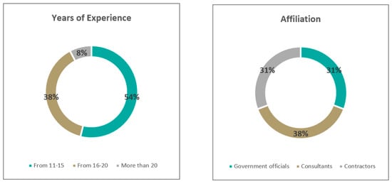 This section presents the demographic information of respondents. Many studies have discussed the optimum number for a panel of experts in Delphi studies, although Ameyaw et al. [] emphasized that the optimum number in construction studies ranged from 8 to 20. Therefore, efforts were made to reach this number of experts in this study, 13 respondents completed all the stages of the Delphi process. To ensure that all the segments of the sector are involved, the government officials represented 30.8% of the panel, whereas contractors and consultants represented (30.8%) and (38.5%), respectively. Detailed categorizations of the participants are presented in Figure 3.