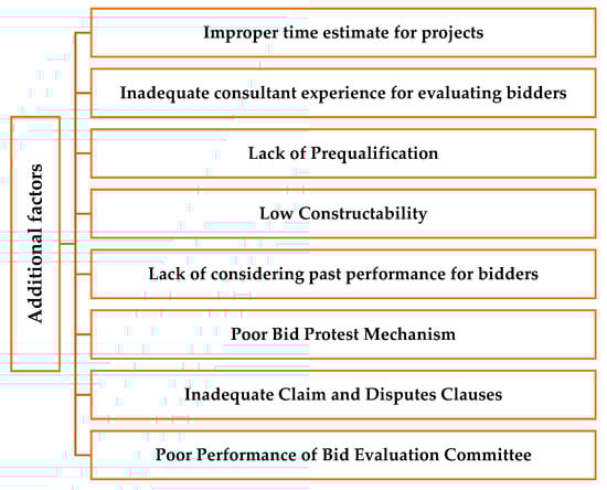 Practitioners throughout the first round of the Delphi questionnaire separately mentioned additional challenging factors in the tender phase. These additional factors were not mentioned in the literature review regarding the tender phase of public construction projects in Saudi Arabia. These additions were due to the option of freely expressing opinions at the end of the questionnaire. Then, practitioners in the second round confirmed the additional challenging factors—in the Saudi context—through consensus and ranking.