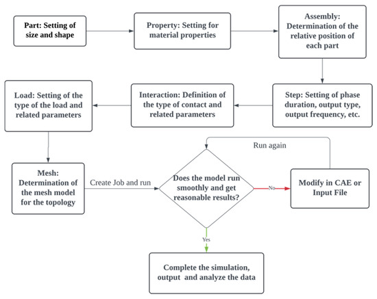 In this chapter, the detailed modeling process of the preliminary compaction in ABAQUS will be introduced. ABAQUS is one of the world’s most advanced nonlinear finite element software and provides a simple uniform interface for creating, submitting, monitoring, and analyzing simulation results. It has progressed to the point where discrete element simulation is now available with this finite element simulation program [23]. The simulation flowchart is shown in Figure 1. Some main steps of the modelling procedure will be introduced in the following sections.