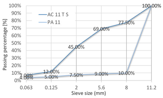 One of the key parts of the compaction model is the aggregates, which were generated by the particle generator in ABAQUS. The particle generator enables a modeling technique in which the DEM is checked only when the particles reach a defined area, which simplifies the construction of the model while improving the computational efficiency [24]. The particles are released in a direction perpendicular to the inlet surface of the particle generator and the flow rate should be determined according to the paving speed. In this study, only one particle generator was used. In order to improve the computational efficiency, the morphology of the aggregates was simplified to spheres, which cannot fully simulate the aggregate interlocking happening during compaction. The approach to simplify the geometry of the aggregates while keep their main features will be studied in the future. The element type of particles released by the particle generator was PD3D, representing discrete particles. In order to investigate the influence of the gradation of the asphalt mixture on the pre-compaction, two different asphalt mixtures, a dense-graded mixture AC11 and a gap graded mixture PA11, were simulated and their gradations are shown in Figure 2.