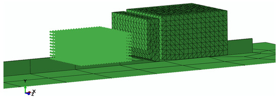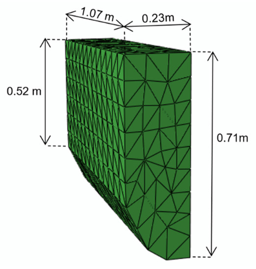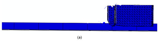 In this study, the other parts including the base and the paver were created and discretized by FEM. The base that was ready to be compacted on by the paver was simplified to a shell 3.42 m wide and 17.14 m long without thickness, on which two shells 0.4 m high and around 1.14 m apart were created as a fence to designate the paver’s work path. As a result of the impact of vibration paver vibration, the unit line pressure is greatly improved, and when the vibration paver continues to make rapid impact on the surface, the same frequency of pressure waves penetrates into the material layer, causing the material particles to move, rearrange, and become denser as a result. Therefore, vibratory pavers are becoming more popular and will be used in this model. The paver has been diminished to its two most fundamental components: the tamper and screed. When the tamper portion was set as indicated in Figure 3, the screed was set as a hollow rectangle with a length of 1.27 m, a width of 1.07 m, and a height of 0.72 m. Since the base, tamper, and screed are assumed as rigid bodies, they do not need to be assigned any material properties.