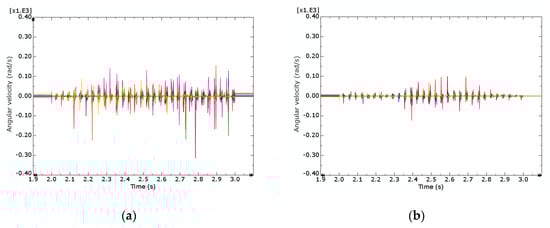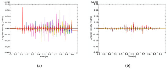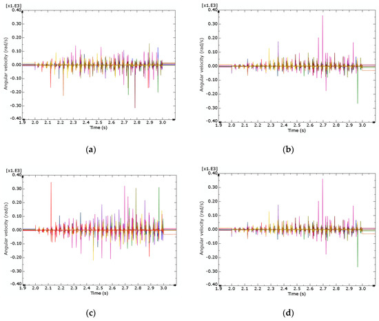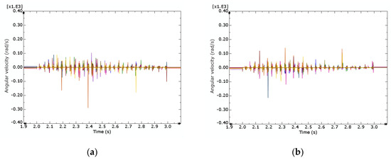 Eight data plots can be found in Figure 6, Figure 7, Figure 8 and Figure 9, where the X-axis represents the time in s, and the time interval from 2.0 s to 3.0 s is chosen, i.e., the time period during which step 2 was performed. The Y-axis represents the angular velocity in rad/s, and the interval chosen after observation is from −0.4 rad/s to 0.4 rad/s. As shown in these figures, during the paving process, the angular velocity of the aggregates fluctuated quickly; this fluctuation is mostly driven by the high frequency of vibration from the paver screed. The peak in the graph indicates that the angular velocity of the aggregate is at its maximum at this point, which means that the paver is acting on this aggregate. As can be seen from the graphs with combined angular velocity, the fluctuation of the angular velocity of AC 11 is generally more significant than the fluctuation of the angular velocity of PA 11: both the angular velocity variation in each direction and the total angular velocity variation show more frequent peaks in the graphs related to the angular velocity of the AC 11 aggregate than in the graphs related to the angular velocity of the PA 11 aggregate.